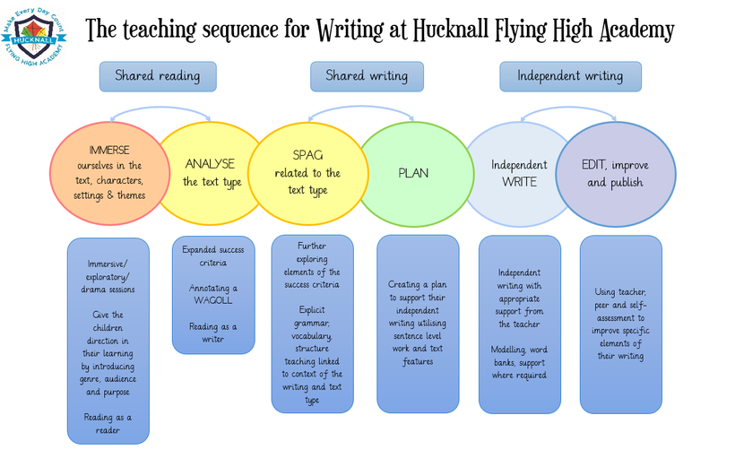 At Hucknall Flying High, we believe that every child is a celebrated writer and reader, with talents that can be nurtured and flourished through our carefully crafted English curriculum. We have structured an English curriculum that provides all children to have plentiful opportunities to embark on their own journey as a writer and reader. Our curriculum strives to develop our children's confidence, skills and talents to empower them to create aspirational, authentic pieces of writing where they explore texts, immerse themselves in a genre and create authentic writing outcomes which are purposeful and creative.